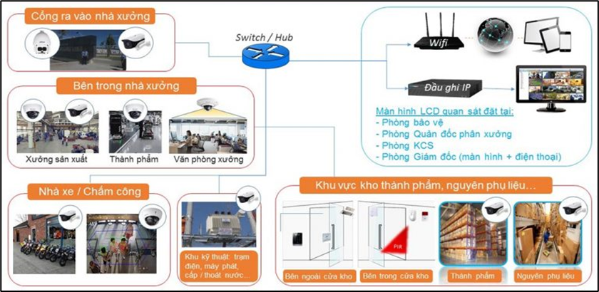 Dựa trên nhu cầu giám sát tổng quan toàn bộ nhà xưởng, giám sát hoạt động sản xuất và giám sát làm việc của nhân viên, giám sát các phương tiện ra vào và cảnh báo cho các khu vực kho hàng, KBVISION cung cấp giải pháp giám sát toàn diện cho nhà xưởng. Giúp người quản lý có thể giám sát hoạt động theo thời gian thực, xem lại các hoạt động, và đảm bảo an ninh 24/7